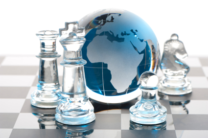 Global Strategy concept with Chess pieces, board and glass earth globe Showing Europe and Africa